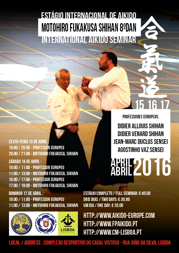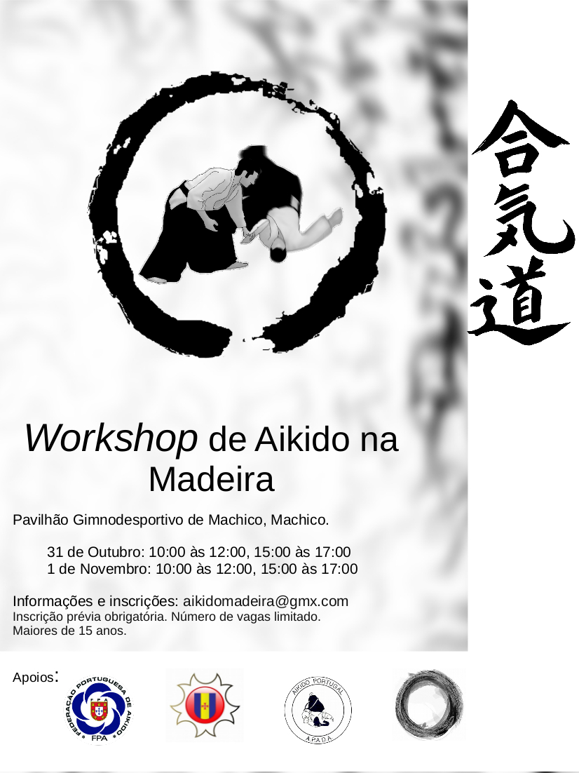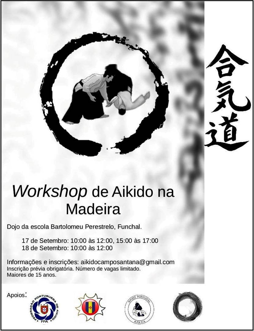 ![]() | Workshop de Aikido na Ilha da Madeira - 17/18-setembro-2016 Dojo da Escola Bartolomeu Perestrelo, no Funchal Sábado, 17-setembro, 10h-12h e 15h-17h Domingo, 18-setembro, 10h-12h Informações e inscrições: aikidocamposantana@gmail.com Com o apoio da Federação Portuguesa de Aikido, Associação de Judo da Região Autónoma da Madeira e Associação Portuguesa de Aikido e Disciplinas Associadas |